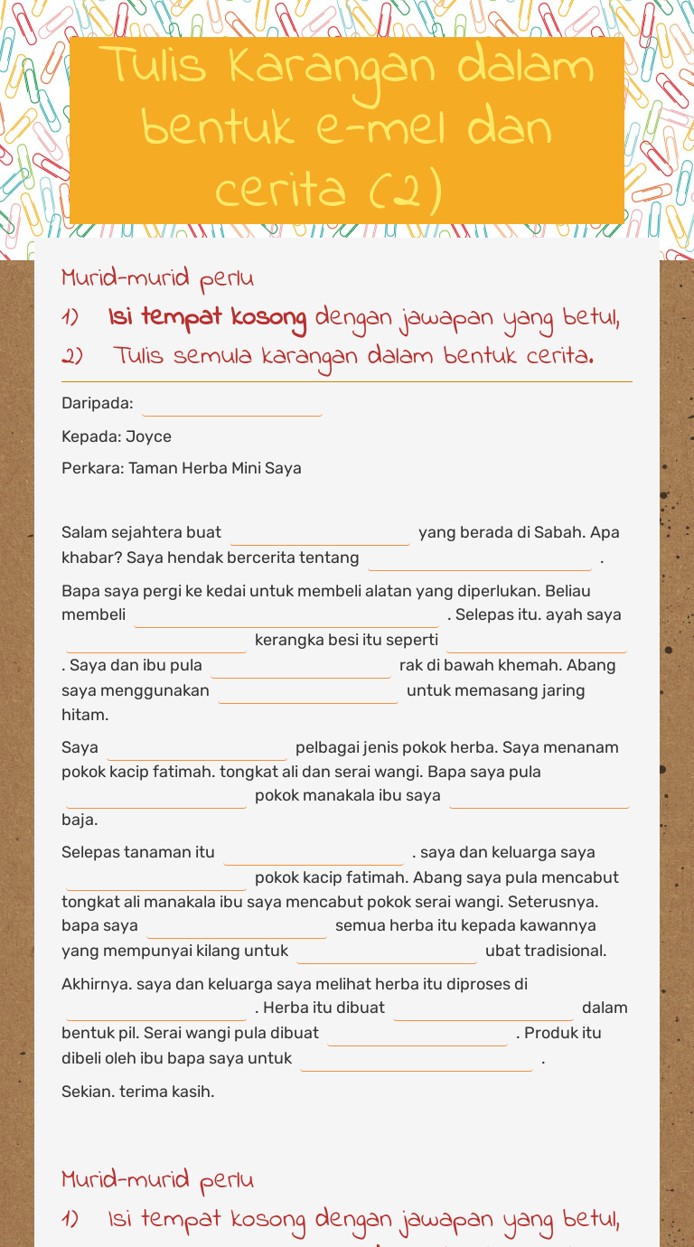Tulis Karangan Dalam Bentuk E Mel Dan Cerita 2 Interactive Worksheet By Tan Yueh Guoo Moe Wizer Me